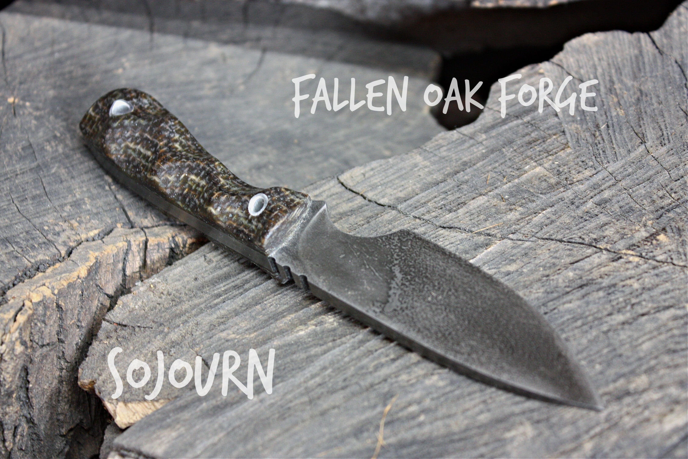Sojourn, 4 1/4" blade, 1 1/4" tall, 8" overall, 1/4" thick FCOMP11 high carbon alloy . Fallen Oak Forge brown burcarta scales. Razor sharp and designed on the smaller side for fine work.