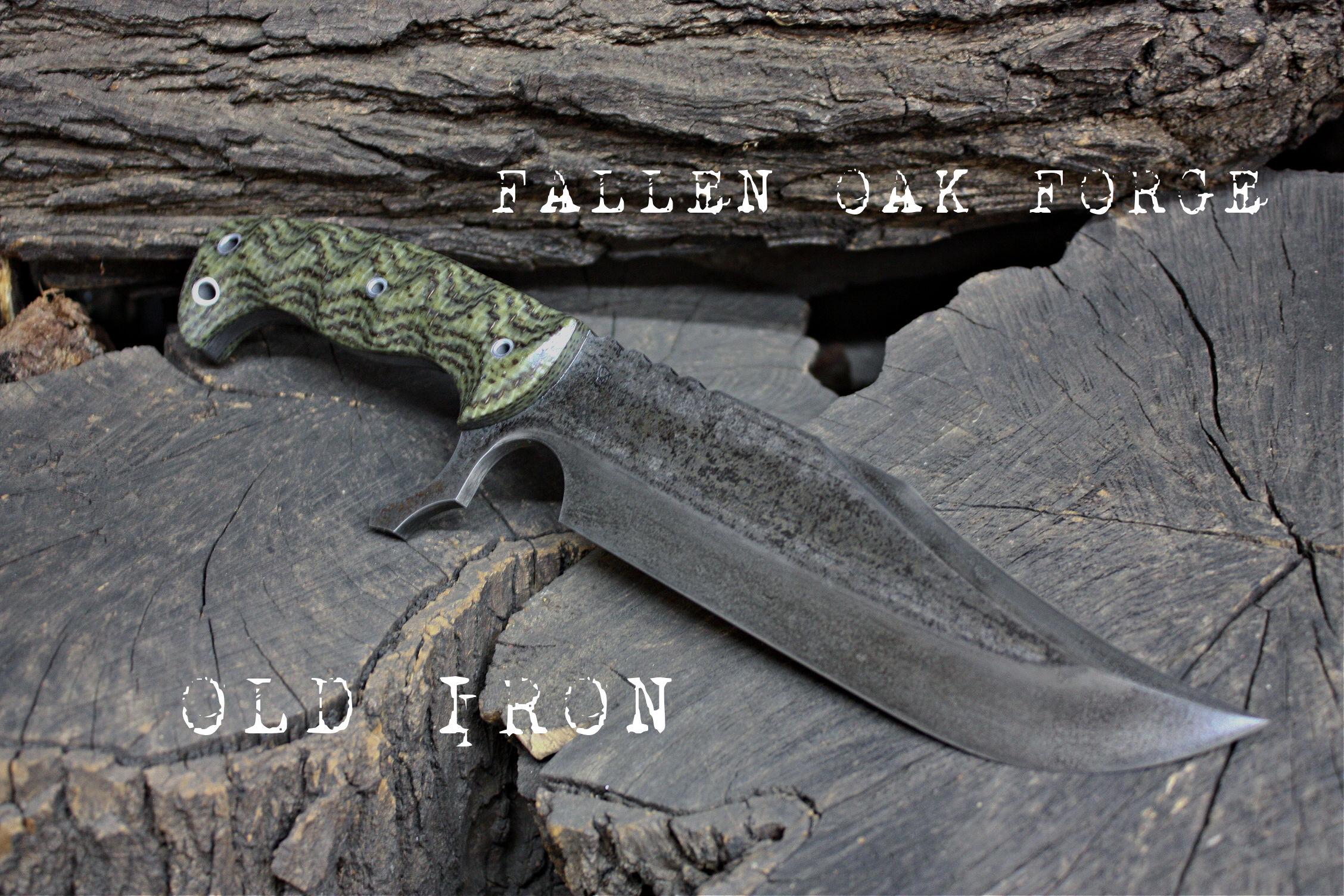 Old Iron, 8" blade, 2" tall, 13 3/8" Overall, one piece 1/4" thick FComp11 high carbon alloy steel tang. FOF olive burcarta scales with hydrofit pins. Clip point brought to edge.